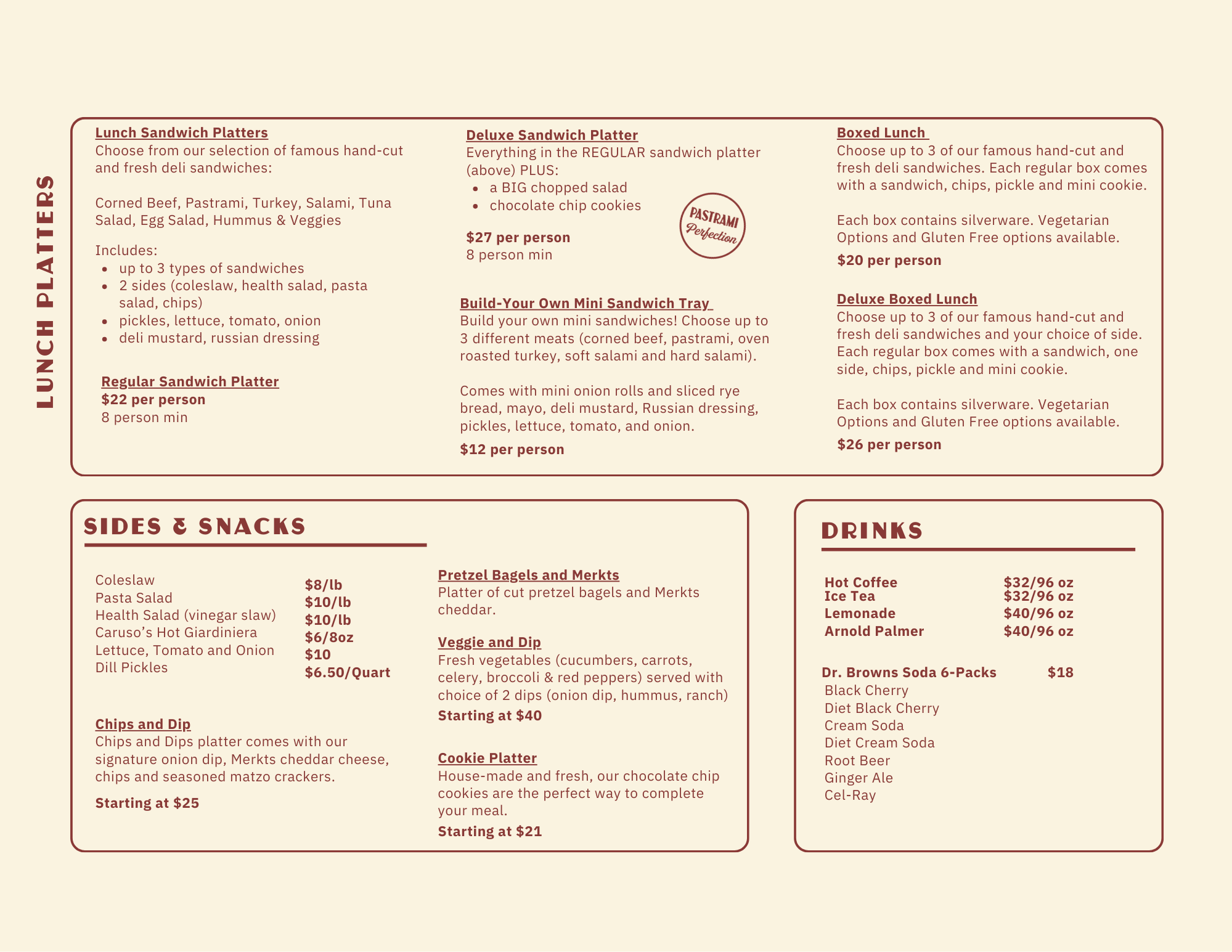 We ask that all catering orders be place 48 hours before pick up or delivery. You can place your order online! Call us (773) 590-1345 or email us at catering@schneiderdeli.com with any questions.